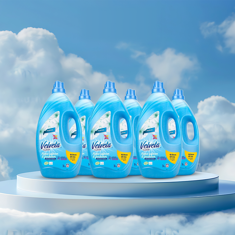 كرتون فلفيتا معطر ومنعم ملابس عدد ٦ عبوات ٣ لتر الخيار الأمثل للأسر الكبيرة، حيث يمنحك نعومة فائقة ورائحة النسيم المنعشة التي تدوم حتى 15 يومًا بعد كل غسلة.